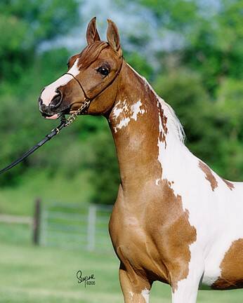 Chestnut tobiano mare sired by TC Miyake (by Zodiac Matador) and out of Rio Kings Ransom by Jordache I. She is 98.5% Arabian Pinto. Foaled 4/21/04. Halter Champion. Named Grand Champion at the Des Moines Memorial Day show and swept the HA Mare classes unanimously! And was Top Five Yearling Sweepstakes Region 13! Ransoms Pedigree.